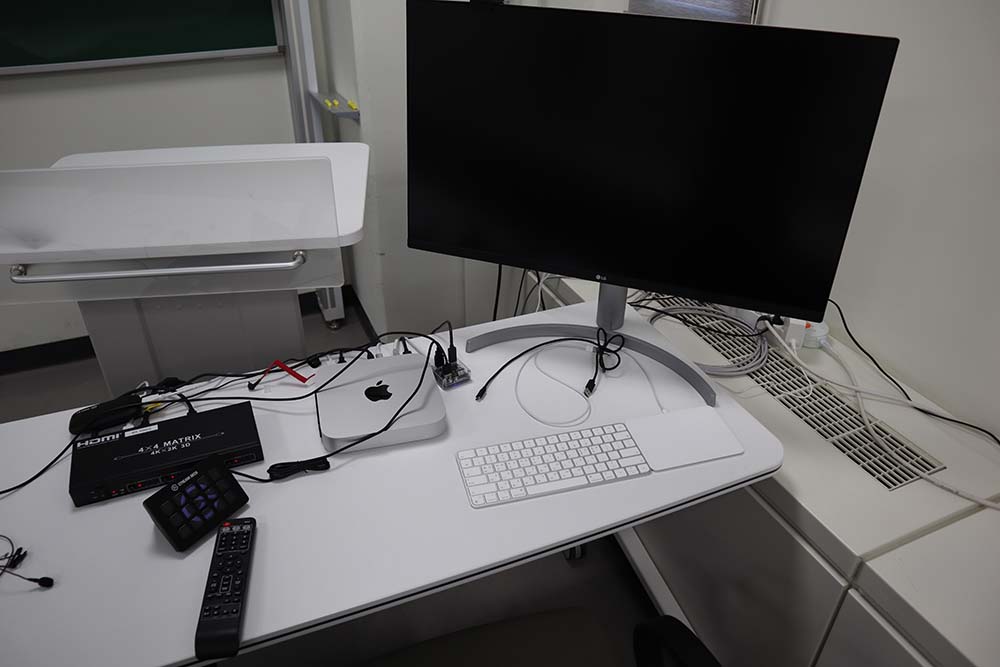동영상 촬영에서 가장 중요한 것이 음질입니다. 원래는 Rode Wireless GO 마이크를 사용하였으나 연사의 소리만 녹음되고 청중의 질문은 전혀 녹음되지 않기 때문에 지금은 전에 온라인 강의용으로 사두었던 Blue Yeti Pro 마이크를 강의실 앞 중간에 두고 쓰고 있습니다. 나중에 천장에 고정해둘만한 적절한 마이크가 있을지 고민해봐야 할 것 같습니다.